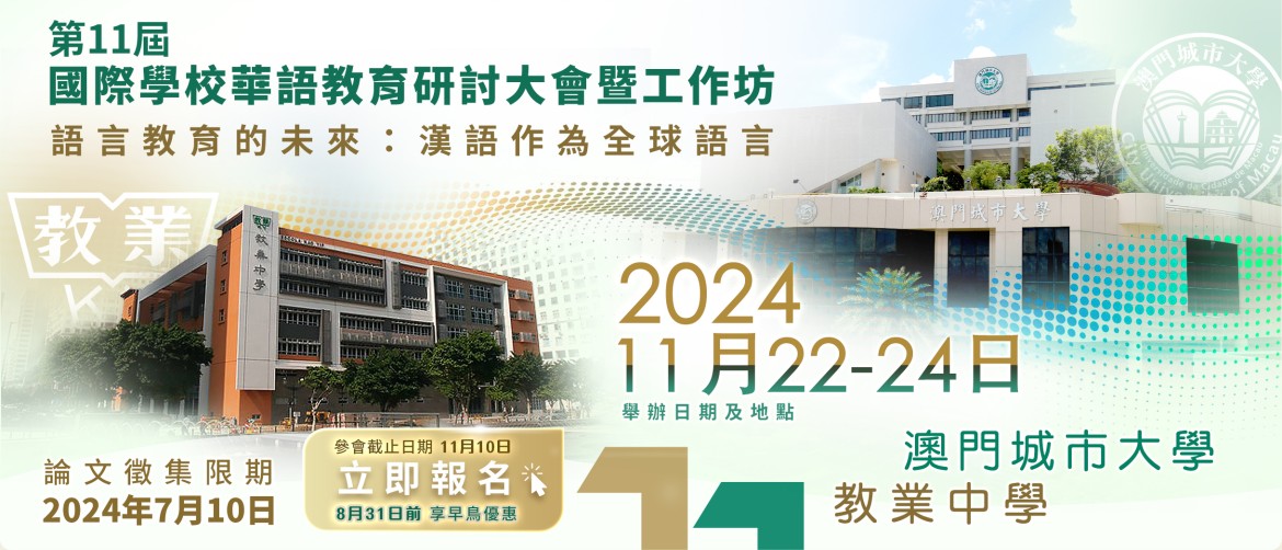在此背景下,香港大学、高雄师范大学、华东师范大学、义守大学、台湾师范大学、澳门城市大学,中国常熟世界联合学院、义大国际高级中学、澳门教业中学,共同决定于2024年11月22日-24日于澳门城市大学和澳门教业中学联合举办“第11届国际学校华语教育研讨会暨工作坊”。